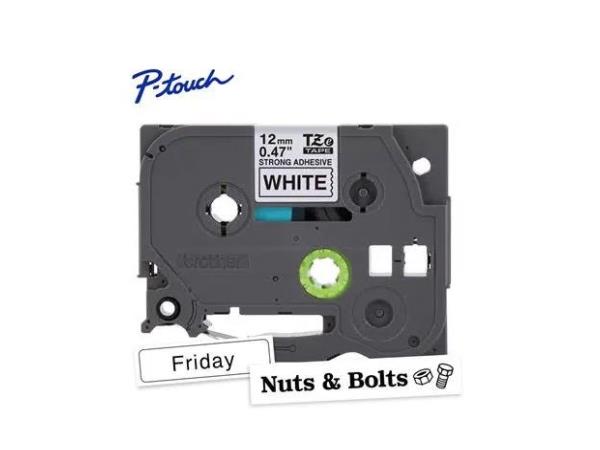 - Black on white TZe 12 mm extra strength adhesive tape for use with Brother P-touch label makers