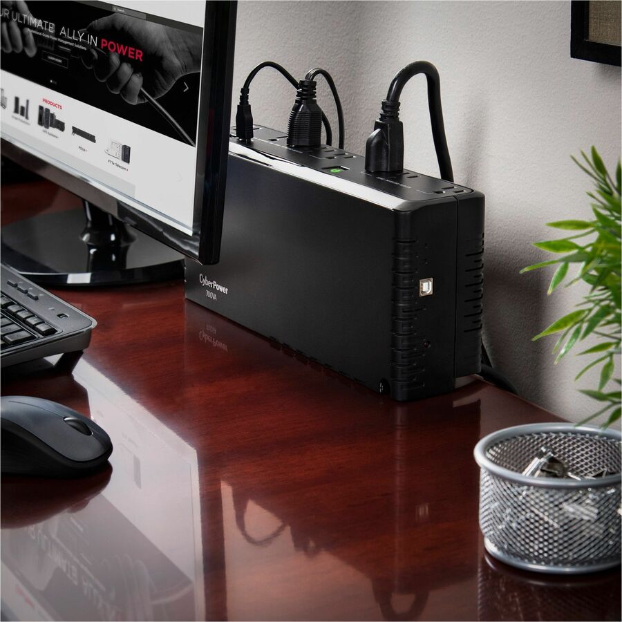 The CyberPower SL700U uninterruptible power supply (UPS) system provides surge protection for lightning-induced surges and other power events that can damage electronic equipment. This unit delivers enough battery backup to connected devices during a utility power failure, so you can perform a graceful shutdown to protect against the loss of data and damage to valuable electronics including computers, gaming consoles, and home networking equipment.