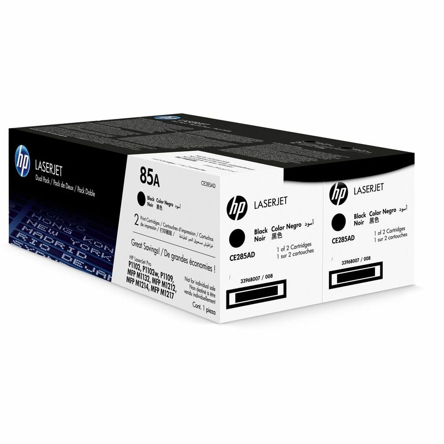 • What’s in the box: Two HP 85A (CE285D) toner cartridges
