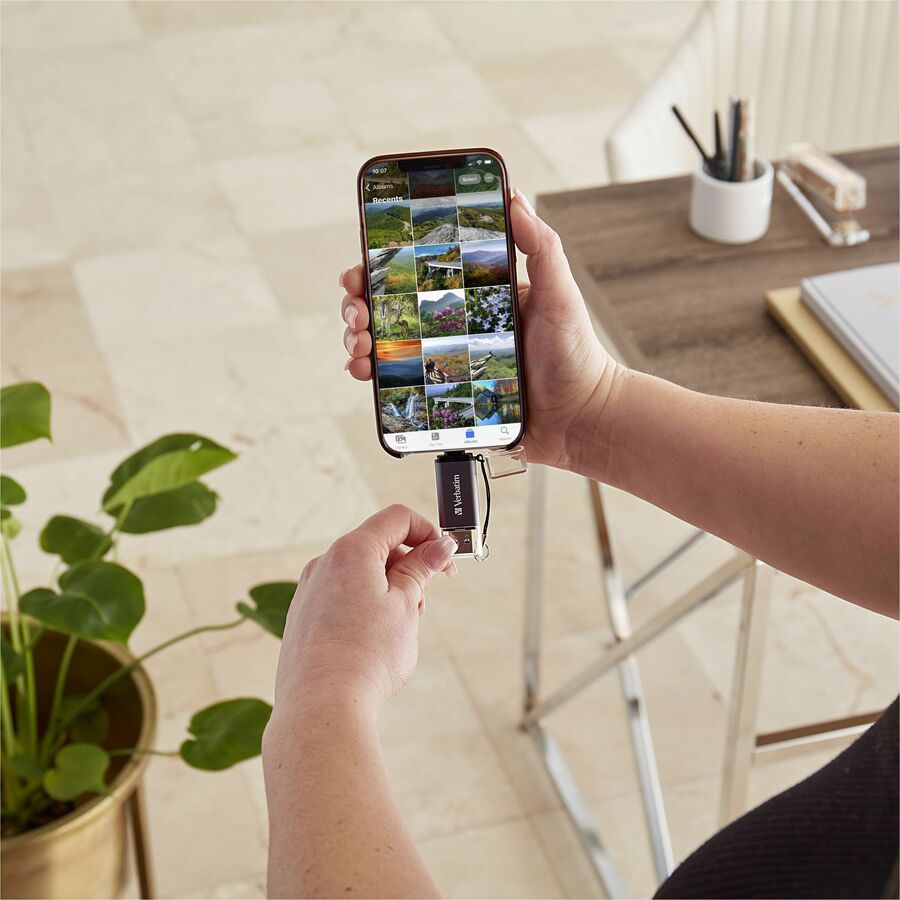 With the free Verbatim Store ‘n’ Go app, available on the app store, the Store ‘n’ Go Dual USB drive allows you to transfer files between your Apple device and USB-A equipped PC or device.